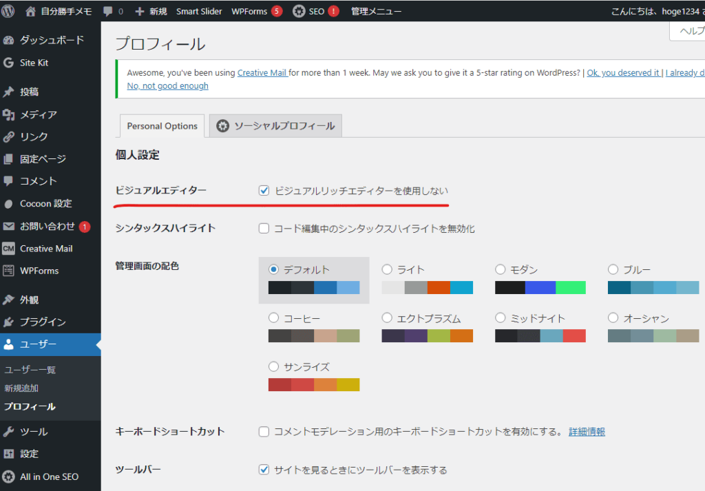 HTMLソースが消えてしまうことがあるため、「ビジュアルリッチエディターを使用しない」にチェック!テキストエディタからビジュアルエディタに切り替えるタイミングで、消えてしまうらしいということが原因